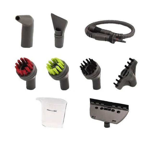 - Tools included: pouring jug, extension hose, detailed brush kit with 3 colour coded brushes, angled concentrated tool, window squeegee, flat scraping tool, 2 microfiber cleaning cloths, accessory nozzle.