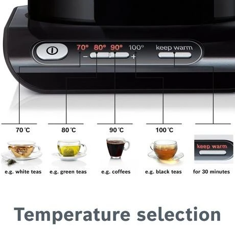 The TWK8633GB kettle boils rapidly and will add a touch of style to any kitchen, coming in a classic white finish. This Bosch Styline sensor kettle can hold up to 1.5 litres of water, which is more than enough for the whole family. To make sure you don’t overfill, there is a water level indicator clearly marked. Thanks to 3000 W of power, you’ll never be waiting long for your drink. And, there are four temperatures to choose from and a KeepWarm function for the perfect cup every time.