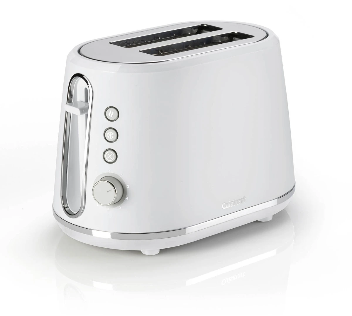 - Contemporary 2 slice toaster, in a warm white, matte finish with polished chrome details
