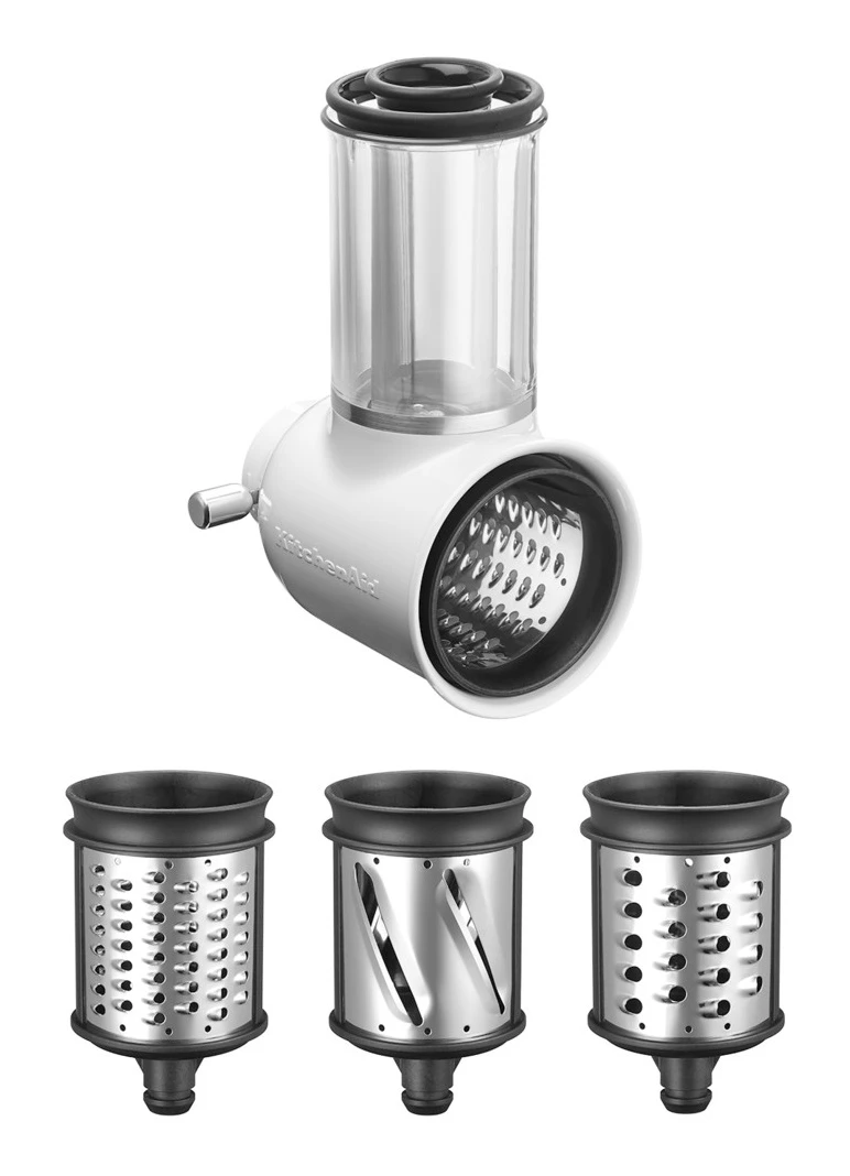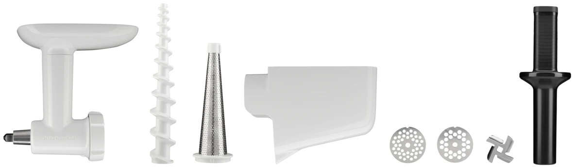 This kit includes 3 essential attachments (5KSMFGA + 5KSMFVSP + 5KSMVSA) for your KitchenAid stand mixer: a fruit and vegetable strainer, a food grinder and a shredder/slicer attachment.Â