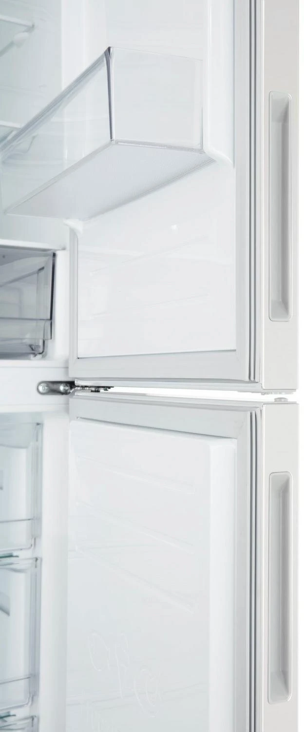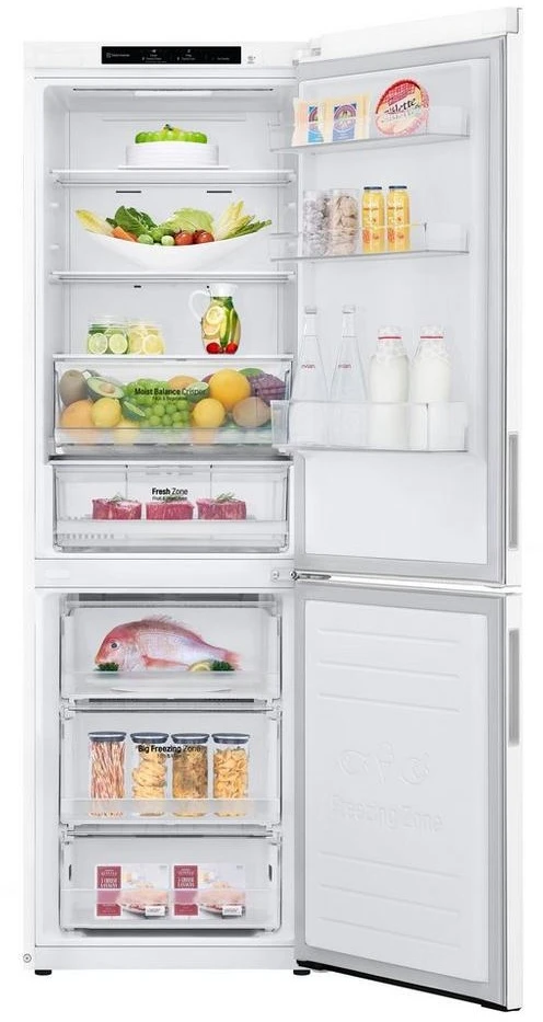 When you open the doors on the GBB61SWJEC, you will see multiple storage options. The 234-litre fridge compartment has three glass shelves, a Moist Balance Crisper, one salad bin, and three door compartments.